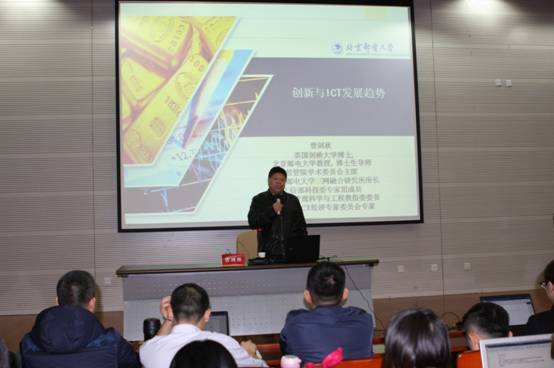 2018年3月21日晚,《坚持新发展理念的基本方略》由北京邮电大学曾剑秋教授以《创新与ICT发展趋势》为题顺利开讲,beat365官网beat365英国官方网站谢玉进老师担任主持。曾剑秋教授是英国剑桥大学博士,现任北京邮电大学经济管理学院教授、博士生导师,三网融合研究所所长,信息经济与竞争力研究中心主任,工业和信息化部科技委专家组成员,教育部管理科学与工程教指委委员,工业和信息化部ICT经济专家委员会委员,北京邮电大学经济管理学院学术委员会主席。在ICT产业政策与市场、企业竞争力、网络融合、5G技术演进、大数据、人工智能、物联网等方面有深入的研究与独到见解。曾教授的授课注重互动,以同学们关心的问题开场,紧密结合“创新”这一主题词,深入浅出地结合我国信息技术的发展诠释了什么叫创新和如何创新等基本问题。曾教授的讲授紧贴时政热点和学生关注点,深刻梳理了2018年政府工作报告和党的十九大报告关于创新的相关论述,对“互联网+”行动计划、“国家大数据战略”“网络强国”等国家战略和部署,进而从创新与智慧社会、国家创新体系建设、智慧社会与智慧城市、宽带中国与信息消费、信息化政策与ICT市场开放、大数据、人工智能与实体经济等方面对我国当前的信息化战略落实、网络强国建设、宽带、数字经济与5G技术、大数据、人工智能和物联网发展及前景进行了详尽的讲解。曾教授的讲授平实而有力、质朴而前沿,深入浅出,娓娓道来,极大地开拓了在场师生的视野,深化了对科技创新的认识和理解。谢玉进老师用“内行、前沿、高端”六个关键词对曾教授的精彩讲授进行了点评,认为曾教授用非常有限的时间系统地清晰明快地梳理了我国复杂的信息化进程,带领同学们很好地领略了ICT发展最前沿的技术风采和社会可能性,带给大家一种高端的资讯冲击和深刻的创新思考,很好地诠释了什么是创新,并内含着如何创新的方法论,对同学们理解创新发展理念有着极大的帮助。200余名同学现场聆听了授课,反响十分热烈。