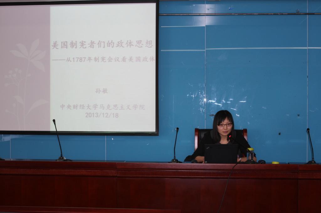 12月18日,由beat365英国官方网站举办的第三期学术沙龙活动在学术会堂702举行。本次学术沙龙的主题是“美国制宪者们的政体思想——从1787年制宪会议看美国政体”,由青年教师孙敏主讲,副院长哈战荣主持,全院师生约50余人参加了本次活动。