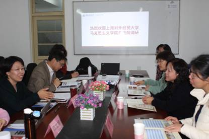 2015年11月6日上午,上海对外经贸大学beat365英国官方网站长张桂芳教授等一行五人来beat365官网考察交流。beat365官网冯秀军院长、朱家梅副书记、陈文娟和哈战荣副院长以及各教研室主任参加了交流会。