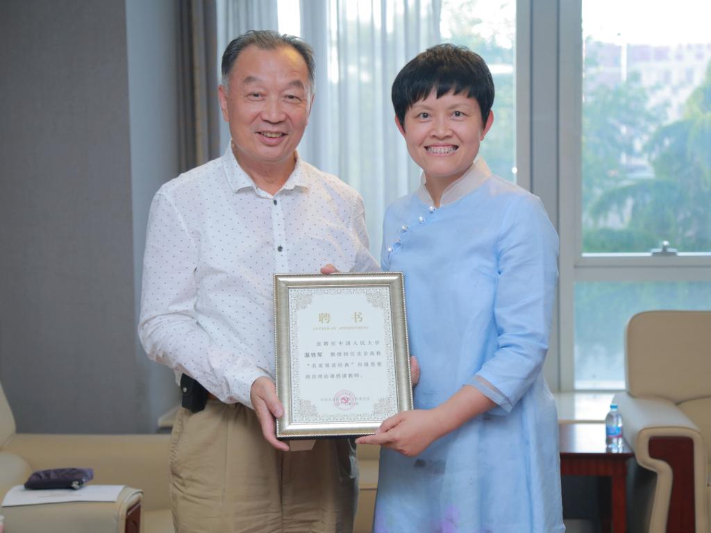授课前,beat365官网校长助理朱凌云热情会见了温铁军教授,与其就大学生读书读经典、人文素质培养、中国当前农村发展现状等问题进行了深入交流,并代表课程组为温铁军教授颁发了“名家领读经典”课程授课教师聘书。