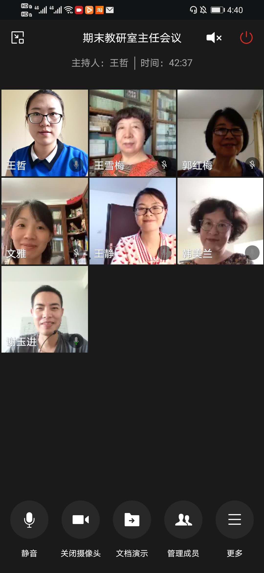 7月15日,beat365英国官方网站采用企业微信在线召开2019-2020学年第二学期期末教研室主任会议。会议由学院教学副院长谢玉进副教授主持,中国近现代史纲要教研室主任王雪梅教授、毛泽东思想和中国特色社会主义理论体系概论教研室主任郭红梅教授、马克思主义基本原理教研室主任韩美兰教授、思想道德修养与法律基础教研室主任文雅副教授、形势与政策教研室主任王静副教授、学院教学科研办公室主任王哲参加了会议。