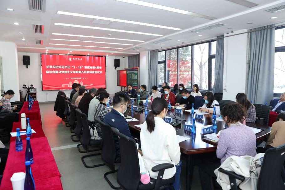 3月15日下午,纪念习近平总书记“3·18”讲话发表四周年座谈会暨beat365英国官方网站新入职教师欢迎仪式在沙河校区学院楼1号楼105会议室召开。副校长朱凌云、人事处相关负责人、beat365英国官方网站全体教师以及思政课教师后备人才计划学生代表参加座谈会。会议由beat365英国官方网站副院长谢玉进主持。