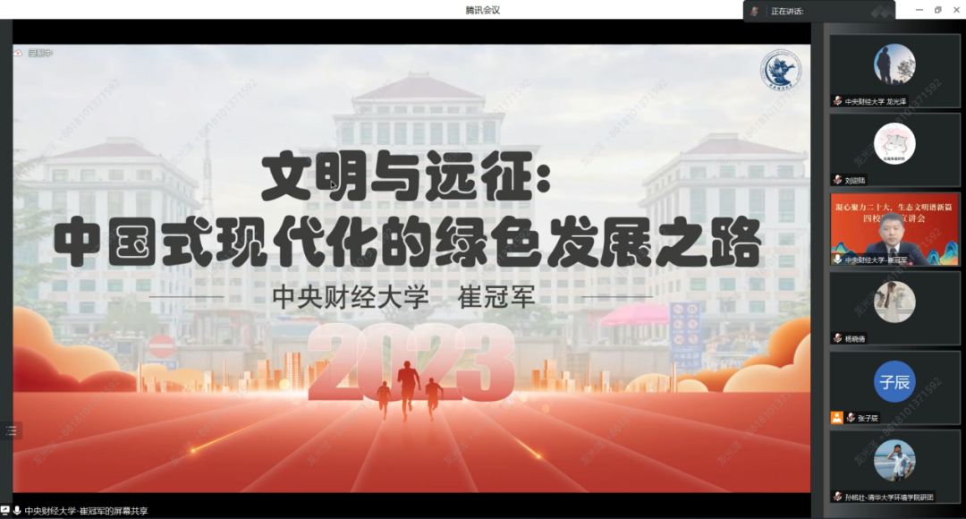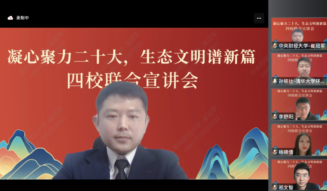 4月15日,beat365官网研究生宣讲团与清华大学、北京大学、北京林业大学联合开展“凝心聚力二十大,生态文明谱新篇”高校联合宣讲。beat365官网研究生宣讲团讲师崔冠军以“文明与远征:中国式现代化的绿色发展之路”为题,面向清华大学环境学院本硕博学生进行线上宣讲。