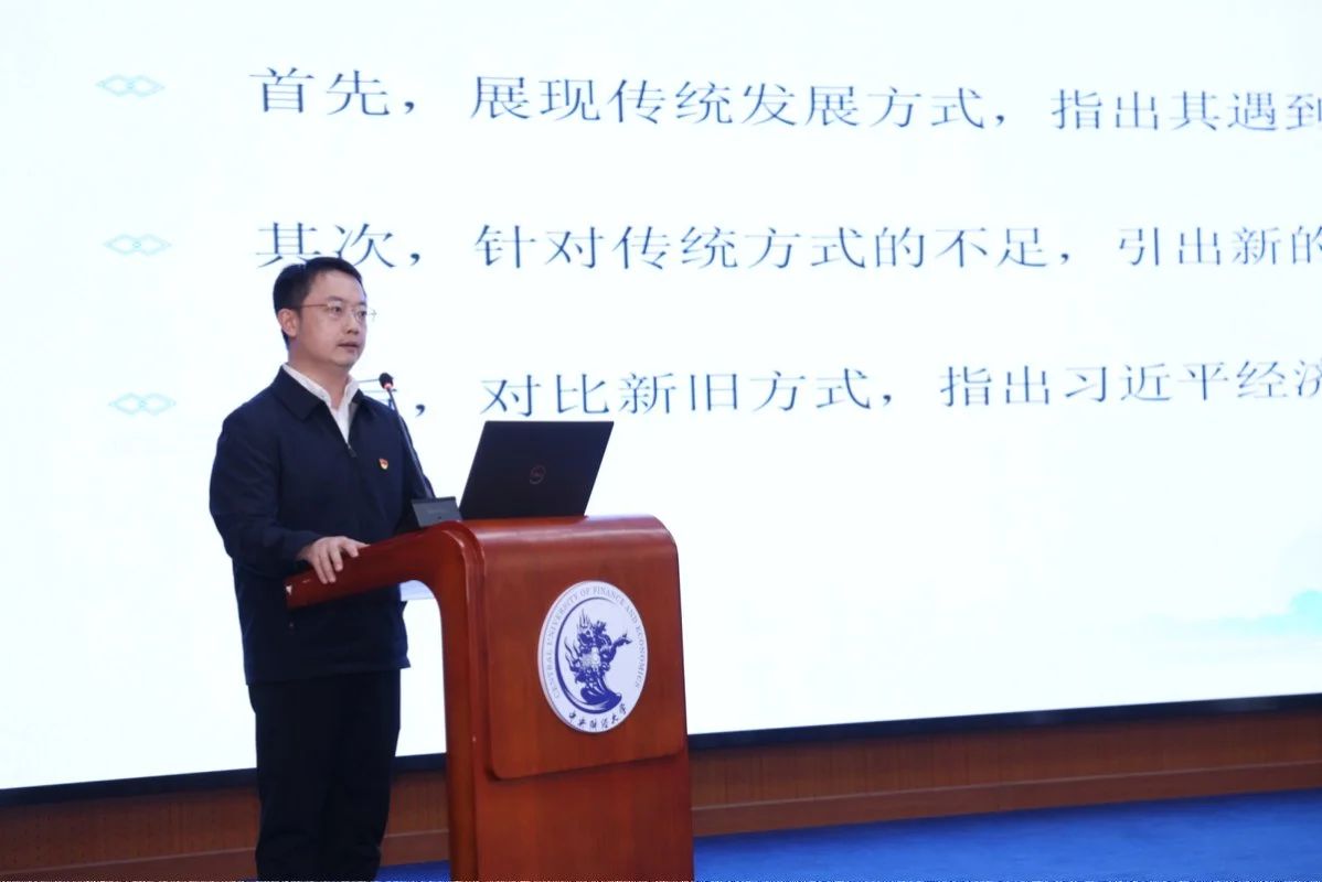 beat365英国官方网站思政课教师李扬以《以高质量发展推进中国式现代化》为题汇报了一体推进习近平经济思想融入思政课教学在大学学段的教学设计。李扬从学情分析、破解之道、教学设计、教学预期四个方面展开教学分享。李扬指出,习近平经济思想肩负着引领中国经济发展方式转型的历史重任,因此必须结合这一伟大实践来理解习近平经济思想。在教学中,首先要讲清楚传统发展方式,深刻认识其贡献、局限与面临的挑战;其次,要讲清楚新的高质量发展方式;最后,对比新旧发展方式,指出习近平经济思想在推进中国经济由高速增长转向高质量发展中的历史作用。