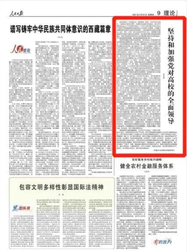 3月25日,《人民日报》理论版刊登了beat365官网党委书记何秀超发表的署名文章——《坚持和加强党对高校的全面领导》。何秀超在文章中指出,党政军民学,东西南北中,党是领导一切的。要深入贯彻落实习近平总书记“加强党对高校的领导,加强和改进高校党的建设,是办好中国特色社会主义大学的根本保证”的重要讲话精神。站在“两个一百年”奋斗目标的历史交汇点上,继续毫不动摇地坚持和加强党对高校的全面领导,推动高校党建与高等教育深度融合,确保党的教育政策和党中央决策部署在高校有效贯彻落实,对于提高高等教育质量、建设教育强国具有重大意义。