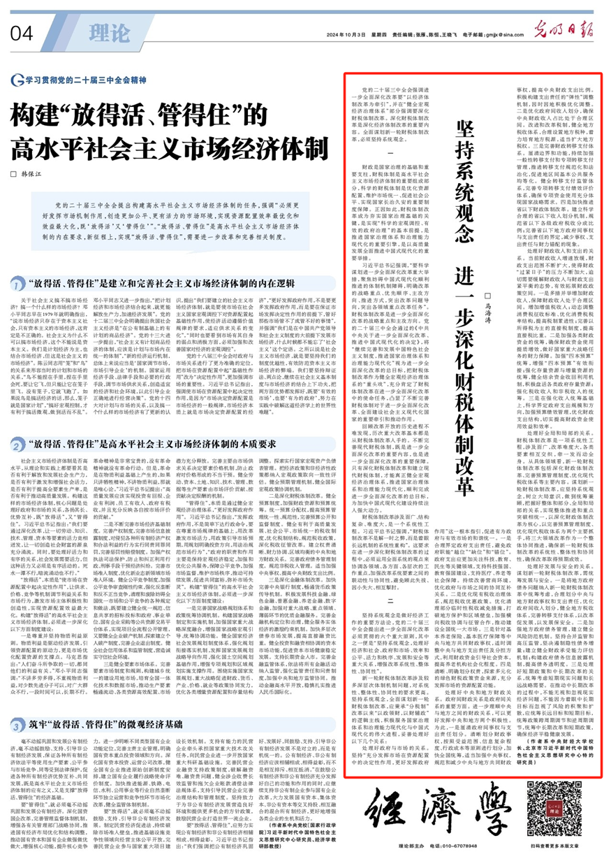 10月3日,beat365官网校长马海涛教授在《光明日报》理论版撰文《坚持系统观念 进一步深化财税体制改革》。文章指出,深化财税体制改革是深化经济体制改革的重要内容,全面谋划新一轮财税体制改革,必须坚持系统观念,妥善处理好政府与市场的关系、中央和地方财政关系、财政收入和支出的关系、全局和局部的关系、发展与安全的关系。
