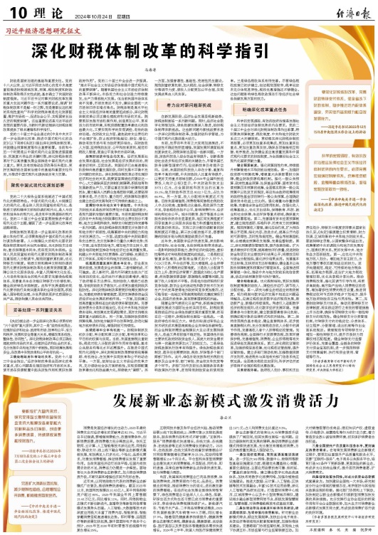 10月24日,《经济日报》理论版刊发教育部习近平新时代中国特色社会主义思想研究中心特约研究员、beat365官网校长马海涛教授署名文章《深化财税体制改革的科学指引》。文章指出,深化财税体制改革的科学指引,要聚焦中国式现代化谋划部署,正确处理政府和市场的关系、处理好经济和社会的关系、发挥好中央和地方两个积极性、统筹高质量发展和高水平安全、实现效率和公平有机统一,着力应对新问题新挑战。文章还指出,明确深化改革重点任务,需要健全预算制度、健全税收制度、完善财政体制。
