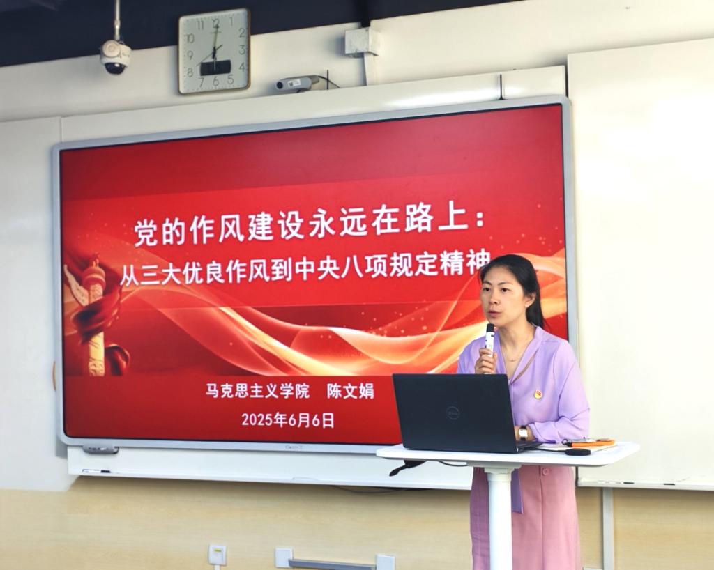 为深入学习贯彻习近平新时代中国特色社会主义思想,进一步筑牢思想根基,强化预备党员与入党积极分子的责任担当,6月6日,beat365英国官方网站党委书记陈文娟面向学院全体研究生积极分子、预备党员,讲授了一堂以“党的作风建设永远在路上:从三大优良作风到中央八项规定精神”为主题的党课。